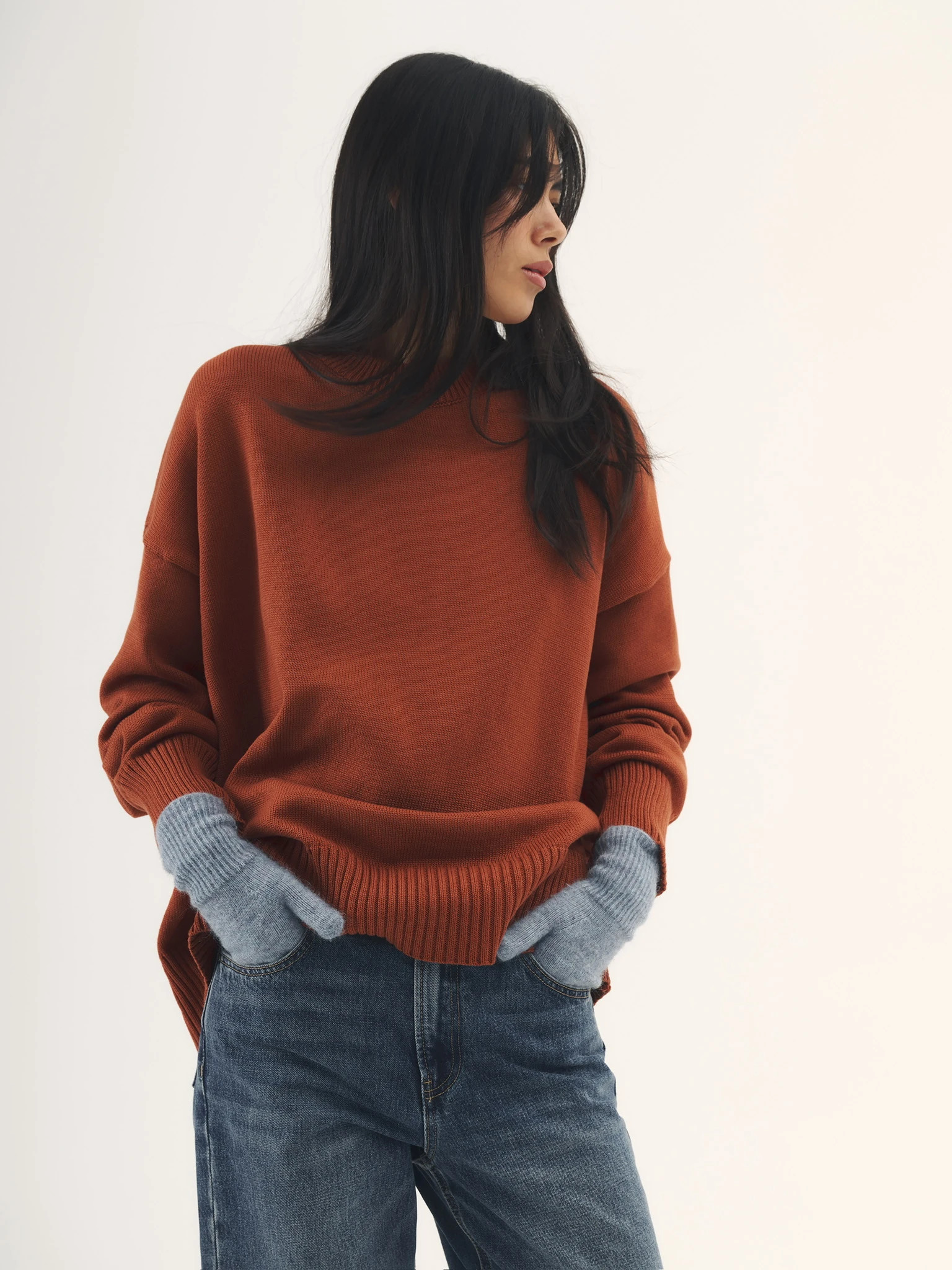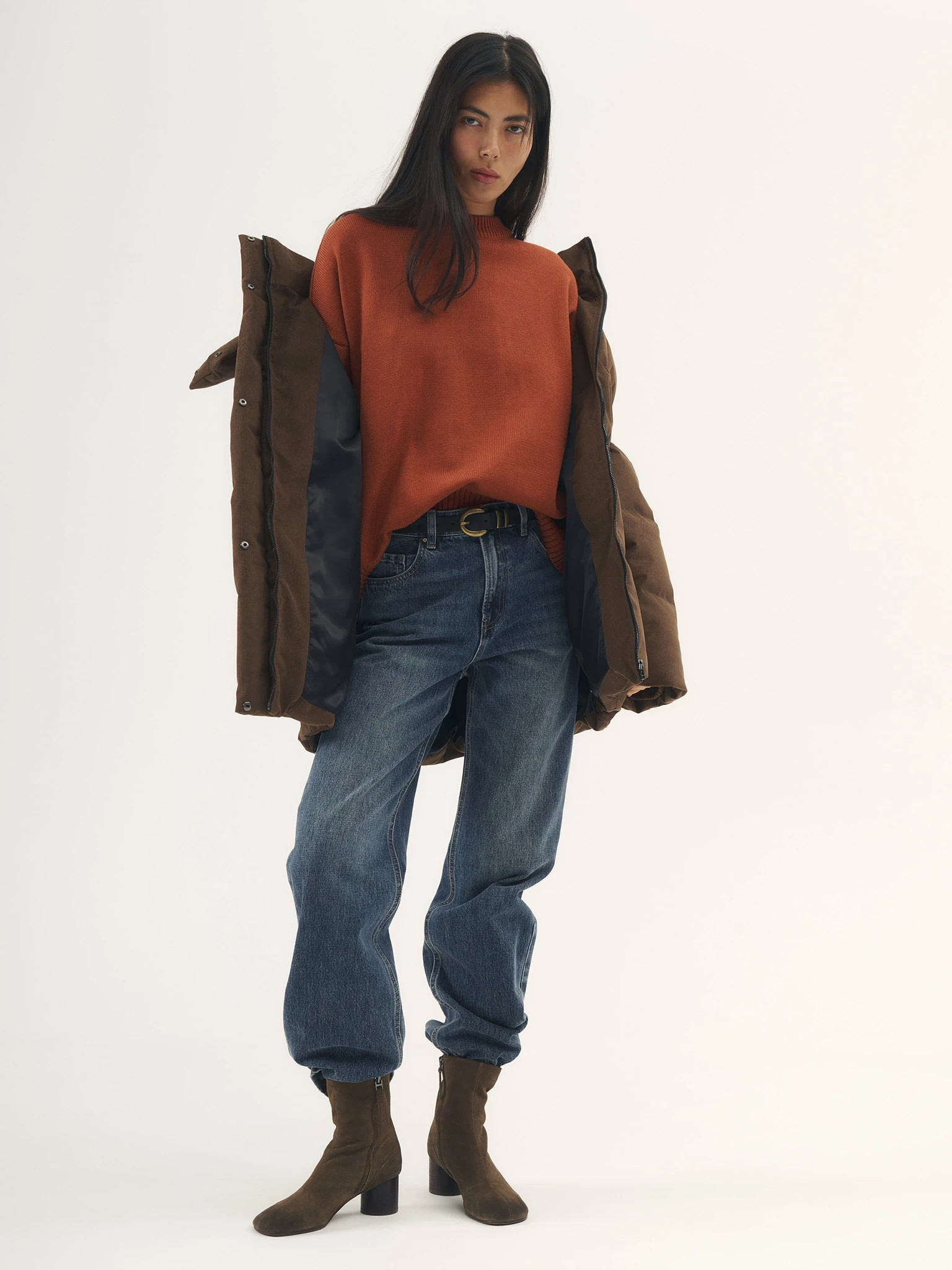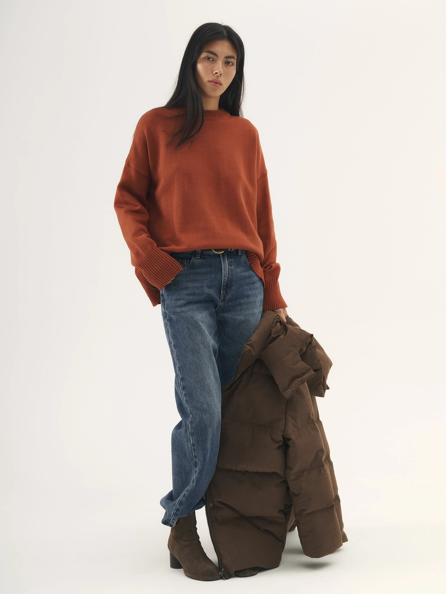 Объемный вязаный джемпер. Выполнен из мягкой хлопковой пряжи. Прямой удлиненный крой, спущенная линия плеча и широкие прямые резинки по нижнему краю изделия и манжетам. Эта модель послужит незаменимой базой в любом гардеробе.